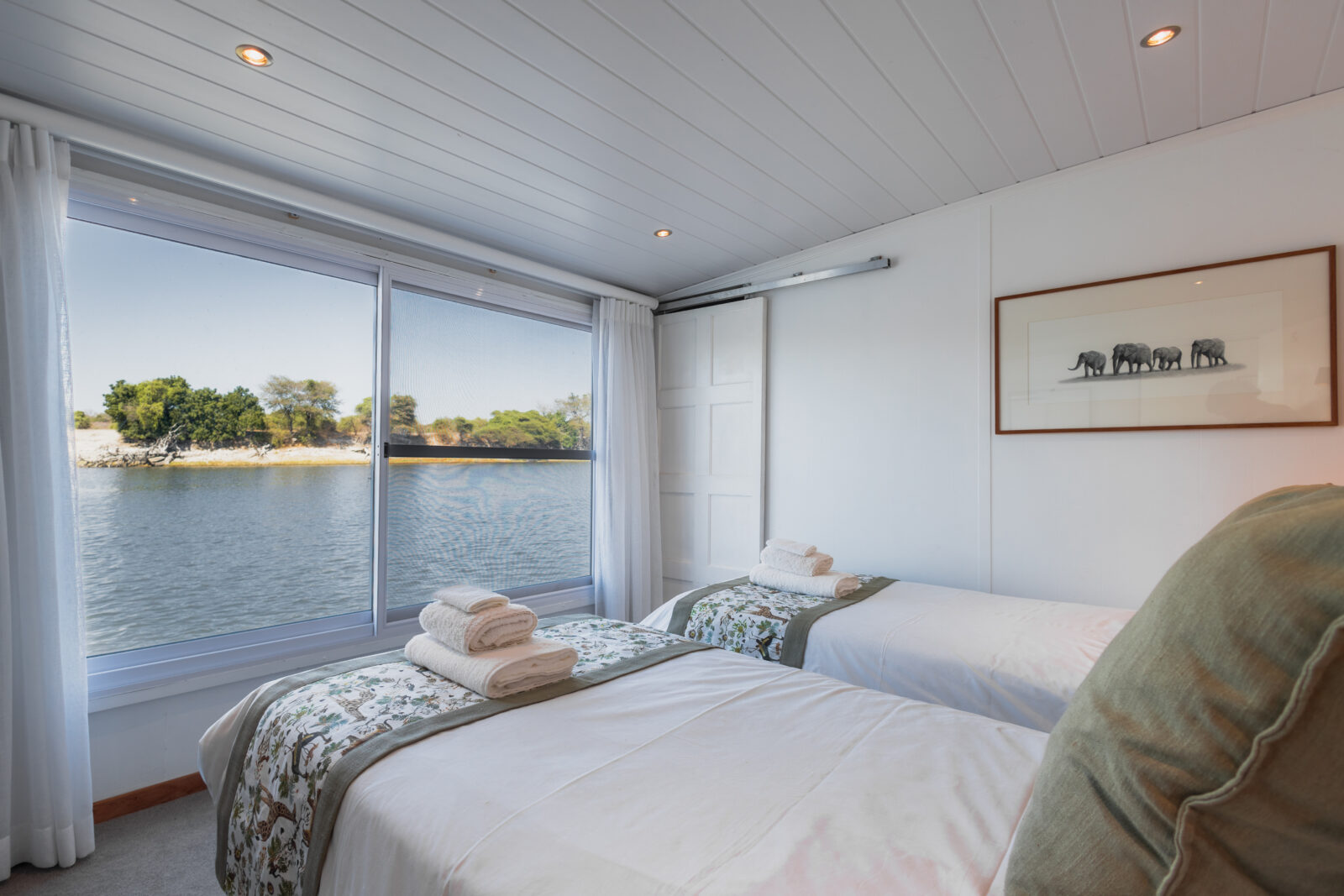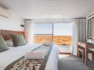 The Chobe Princess boat experience is an intimate river safari adventure along the Chobe River, combining comfort and closeness to nature. With only a handful of spacious cabins, this boutique boat offers a cozy, personalized experience that lets you unwind with views of elephants, hippos, and countless birds right from your room or the viewing decks. Each day features water-based safaris with expert guides who navigate hidden channels, bringing you close to the action. Between excursions, you can relax on the sundeck, take in the sunset over the river, or enjoy freshly prepared meals under the open African sky, all while floating through one of the continent’s richest wildlife areas.